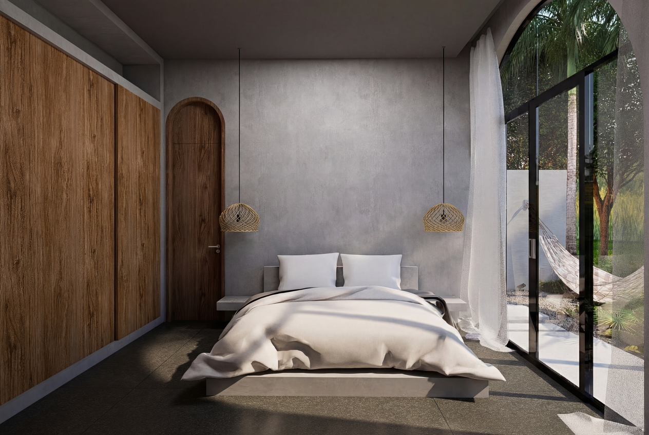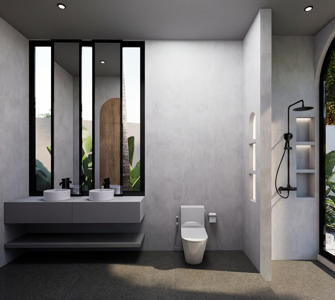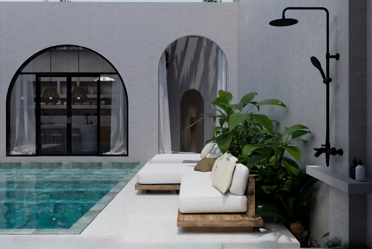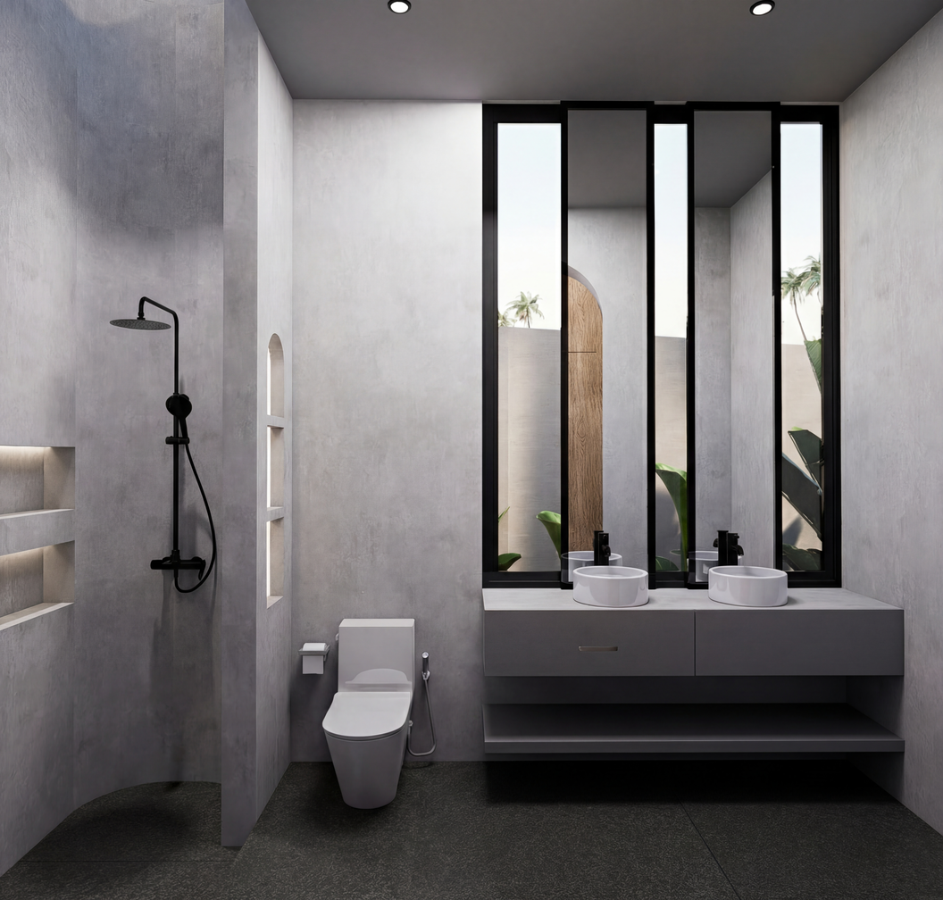 Raw concrete forms the backbone of the architecture, softened by layered greenery, filtered light, and natural textures. The design balances structure and softness, creating a space that feels grounded and relaxed.